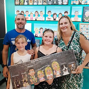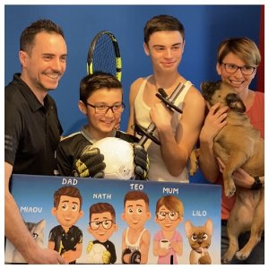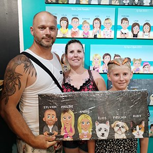 Ajoutez votre animal à votre portrait de famille personnalisé et créez un souvenir inoubliable. Chez Famille de Dingue, c’est vous qui composez vos personnages, dans notre univers graphique unique. Et le résultat ? Dingue. Forcément !!!